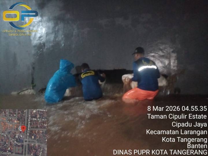 “Kami langsung bergerak cepat menerjunkan petugas untuk mengantisipasi banjir akibat hujan deras sejak tadi malam termasuk melakukan penambalan darurat untuk menekan debit air aliran kali akibat kebocoran tanggul di sekitar kawasan perumahan Taman Cipulir,” ujar Iwan, Minggu (8/3/26).